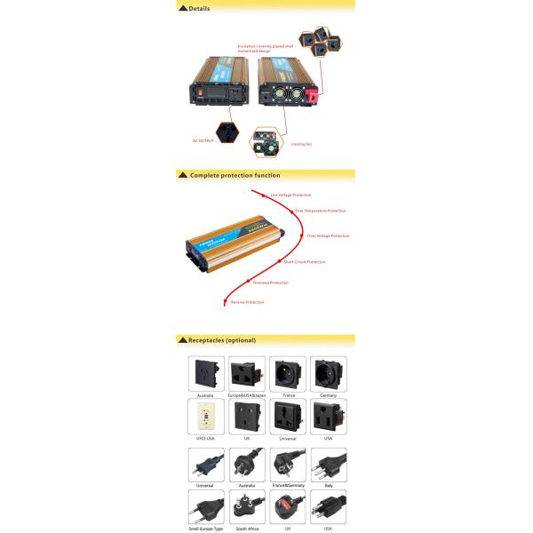 with external fuse, reverse connect, full power, mini size and Under voltage, Over voltage, Over load, Over temperature protection,3 pin compatibility 2 pin socket.